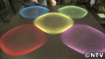 スーパーボールを使い分けて音を変え、テーブル上の砂を自在に操ります。
