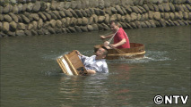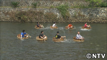 伊東温泉の中央を流れる松川の約400メートルを、大きなタライに乗って