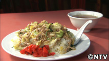肉チャーハンとは、卵チャーハンに肉とキャベツを炒めたアンを乗せたもの。