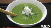 スープは玉ねぎや人参などの香味野菜とともに小松菜を裏ごしし、丁寧に絞られた汁に鶏がらスープと生クリームを混ぜています。