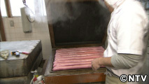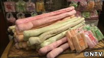 現在さくら棒は県内の4件ほどの製麩会社で作られていますが、こちらの三島食品では、ノーマルなさくら棒の他に、果物などのフレーバーをつけた12種類ものさくら棒があり、色も7色あってとってもカラフルです。