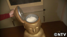 あしざわさんが制作したライスボーイシリーズの「ほかほか様」は、金色の仏像の頭が炊飯器になっているというとてもユニークなもの。15年ほど前に、考えが煮詰まった時の、頭と炊飯器が似ているということから思いつき、匂いや食べるという行為も含めて、五感を感じてアートを作りたいと思ったのがきっかけだそう。