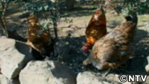 ニワトリ達は毎日夕方になると、外敵から身を守るため、ジャンプして木に飛び上がり、夕日に当たりながら眠りにつきます。近所の人からも人気で、子どもたちのお散歩コースにもなっています。