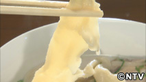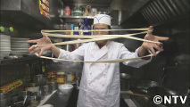 横浜中華街にある中華料理店。こちらの「手打ち太麺のチャーシュー麺」に使われる麺は、端がないドーナツ状になった一本麺。この麺は元々、中国・海南省の家庭料理として作られているもので、「切れ目なくいいことが続く」という縁起を担いだものだそうです。小麦粉を塩と水だけで練り上げた生地を平らに延ばし、生地の真ん中を縦に裂いてドーナツ状にしていきます。