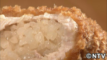 しょうゆダレで味付けしたおむすびを豚肉でくるむように包み、衣をつけカラリと揚げて作ります。香ばしくキツネ色に揚がったら、あとは、ソースやお醤油につけて出来上がり。