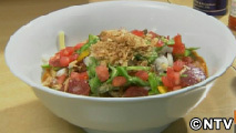 ピザソバは、麺にピザソースをかけ、トマトとサラミとピーマンとアンチョビとパプリカをふりかけてチーズと和えた、まさに「ピザソバ」!見た目ほど味は濃くなく食べやすいと評判です。