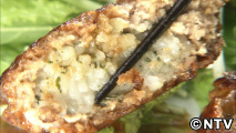 ご飯ばーぐは、エゴマだけを食べて育ったエゴマ豚を使用したハンバーグ生地にガーリックライスを乗せて包みます。和風のタレは砂糖と醤油と豚の肉汁のみ。