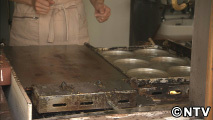 お好み焼きはまずガスの鉄板に生地を作り、そこに細切りのキャベツ、ショウガ、エビ、あげ玉などを乗せ、卵を落とします。生地をよくかき混ぜ電気の鉄板で挟みます。こうすることにより中の野菜の水分もはさみこんで焼き上げる事が出来るので、フワフワでボリュームのあるお好み焼きが完成します。