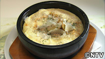 生卵にご飯をメレンゲ状に泡立つまでよくかき混ぜるのがポイントで、それをアツアツに熱した石鍋に入れて、さらにソースを加え、具材やチーズなどをのせれば出来上がり。