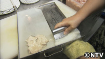豚肉腸粉は、水に溶いた米粉を平らに延ばし、豚肉を載せて特殊な蒸し器で蒸しあげます。それをヘラでかき集めることで、プルプルとした独特の食感が生まれるのだそうです。腸粉自体の味はあまりないため、醤油味のタレをかけていただきます。