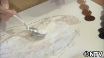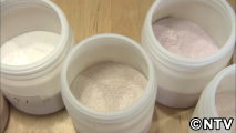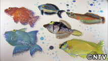 水吉さんは、20年ほど前に、ガラスを粉の状態にして、粉ガラスから作品を作っていくパウダーフュージングという技法を考案しました。従来は粘土と石膏で型を作り、ガラスを流し入れる方法でしたが、最初から最後までガラスに触れながら作品作りがしたいと、この技法を考案したのだそうです。ガラスを粉にすることで、誰でも扱いやすく、自由自在に絵を描けます。ガラスでできた魚のランプは、約60種類。粉ガラスで作ることによって、色が多く難しい魚も、表現することができるのだそうです。