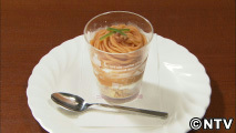 ナポリタンケーキは横浜を中心に活動する日本ナポリタン学会に頼まれて、今年できたスイーツです。他の商品に比べ全く甘くないのが特徴でコーヒー・紅茶よりも、お酒に合うと評判です。たまねぎのクッキーの上にクリームチーズ、その上に白餡とケチャップを混ぜた“ナポリ餡”を乗せ最後に本物のピーマン、ベーコンをトッピングし完成します。電子レンジで温めて食べる方法はアルバイトのスタッフが残ったナポリタンケーキを食べた時に偶然出来た食べ方だそうです。
