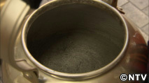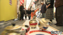 きっかけは、トリノオリンピックのカーリングブーム。商店街の役員たちが夏のイベントのゲームを考えていたところ、目の前にたまたま使われていないヤカンがあり、これがカーリングのストーン代わりにならないかと、思いついたのだそうです。商店街理事長兼靴屋の金谷さんが仕事の合間に、手作りで公式のヤカンのストーンを作っています。