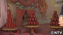 台に積まれたボトルを、ボールを投げて台から落すという遊びです。