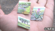 米だけではなく、小さなキャンバスに油絵や水彩画で風景を描いたり、えんぴつの芯で彫刻を作っています。特に0.05ミリの鉛筆作りや、拡大鏡を使わず、肉眼で作った1.5ミリ四方の紙での折鶴など、世界的にも最小クラスのミクロアートを作成しています。
