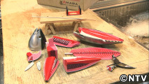 解体した部位を本物のマグロと比べても見劣りしない出来栄えでマグロを置く台や包丁なども忠実に再現してあります。