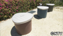 川口市に依頼されおよそ10年前に作った防災ベンチは、赤色のベンチにかまど、青色のベンチにトイレ、グレーのベンチに防災グッズが入っていて、川口市内の公園に6か所設置されています。