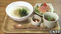 人気なのは、ベジ粥という季節感のある日替わりメニュー。この時期は、夏野菜をたっぷりの冷たいだし汁をかけた、冷製のお粥がいただけます。