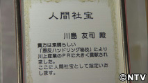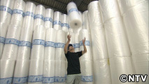 社内には、倉庫のプチプチを投げて整理する名人がいます。プチプチ投げ名人の川島さんがプチプチを投げ始めたのは、約23年前。プチプチの出荷量が増え、脚立を使って積み上げていく効率の悪さから、プチプチを投げて上に積み始めたのがきっかけだそう。63歳の今でも、一日約1000本近くのプチプチを投げています。この投げ方を始めたことで、仕事の効率が上がり、会社に多大な経済効果を生み出しているらしく、会社から「人間社宝」と認定され、表彰もされました。