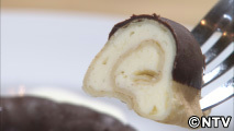 半分に切ったクレープの生地をくるくると巻いて棒状にし、型に入れてリング状にしています。中のクリームにゼラチンが混ぜてあり、冷やすとリング状で固まるのだそうです。