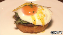 こちらのお店では考えた時に流行っていたのと、和食屋が多いのであえて洋食と合わせたら面白いのではないかとハンバーガ屋ということでパティを乗せたエッグベネディクトを出しています。