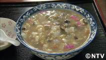ガタタンとは、たくさんの具材を含んだスープという意味で、漢字で「含多湯」と書きます。団子・フキ・タケノコ・シイタケ・豚肉・こんにゃく・竹輪・卵など10種類以上の具を入れ、とろみをつけた塩味の中華スープです。元々は、戦後中国からこの芦別に帰ってきた村井豊後之亮さんという人が、中国の家庭料理を基に作った料理。 こちらのお店では、村井さんが亡くなったあと、ガタタンを復刻。それをきっかけに、現在では色々な店がそれぞれアレンジしてバリエーションが増え、多くのお店で食べられる芦別名物になったのだそうです。