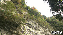 白い岩肌に映える赤いモミジが心に染みます。