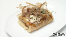 社長のくるくるロールは、社長の熊坂さんが考えたオリジナルメニュー。たこ焼きの生地に、キャベツや紅ショウガ、天かす、ベビースターラーメンをのせ、くるくる巻けば出来上がり。お店の新商品だそうです。