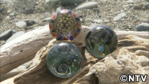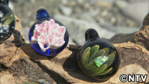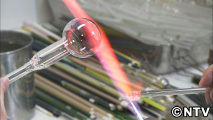 森川さんの作品は酸素バーナーと言われる強力なバーナーを使いポロシリケイトという調理器具や理科の実験器具に使われる耐熱性のガラスと金や銀などを混ぜることで作っています。