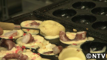 タコ焼きの源流である明石焼きと大阪のタコ焼きの中間を目指した生地に、タコは「どうせなら東京で一番大きなタコを入れる!」と、蓋で閉じるタコ焼きの作り方を考えました。