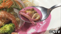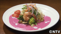 鮮やかなピンク色のソースは、西洋野菜のビーツをミキサーにかけペースト状にしたあと、ココナッツミルクとチキンスープを混ぜて作ります。