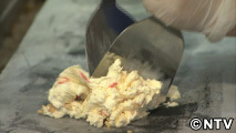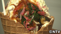 宮下さんが食べた「月島もんじゃアイス」は、紅ショウガ、桜エビ、青のりなどの具にお好みソースをかければ完成。甘しょっぱい味が楽しめます。