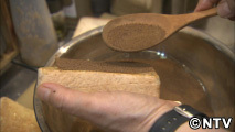 パンは、世界遺産の白神山地でとれた酵母を使用し、友人の料理人が考案した黒糖とシナモンとほうじ茶などの茶葉をブレンドしたオリジナルシナモンパウダーを振りかけてオーブンへ。焦げる寸前まで焼けば出来上がりです。