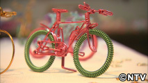 一本のカラフルな針金をペンチと指で器用に自転車へと仕上げていきます。