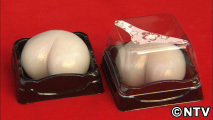 「妖怪いちご大福」はもちろんのこと、新製品「美尻」は芸者さんのお尻をイメージし、ほんのりピンクがかったツルリとした見た目が印象的です。パッケージには下着の形をしたシールが貼ってあります。