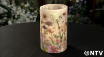 キャンドルアーティストの神谷さんが手がけるフラワーキャンドルは、ロウソクの周りに押し花をあしらった美しいもの。