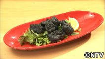 衣に竹炭パウダーを練り込んだ「若鶏の黒唐揚げ」。そして、もずくやめかぶ、ひじきなどの海藻と、モロヘイヤやあしたばなど10種類以上の食材が入った「元気が出る野菜のお好み焼き」など、見て食べて楽しい、独創的な料理の数々が楽しめます。