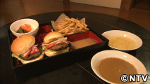 ハンバーガーの肉は、和牛100パーセント。フライドポテトと鎌倉野菜のピクルスがセットになって、和のお重にのせて提供されます。