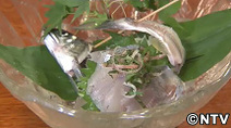 秋の産卵期に川を下ってきたアユを「落ちアユ」といい、さっきまで泳いでいた新鮮なアユを3枚におろし、皮を剥いで、氷で締めて刺身にします。別名「香魚(こうぎょ)」といわれ、口の中に甘い香りが広がります。