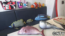 ウエットスーツを作る時に出る切れ端を無駄にしたくないと、「魚拓ッション」を思いつきました。