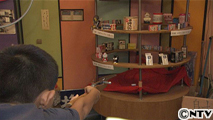 夜店などで定番のコルク玉を打つ射的コーナーでは、御主人の息子さんが担当。