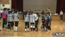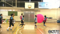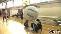 キンボールは1986年にカナダで生まれたスポーツ。直径122cm、重さは約1kgのボールを使用し、4人1組で構成された3チームがコート内でヒットやレシーブを繰り返すゲームです。攻撃側は「オムニキン○○」と相手チームゼッケンの色を指定し、サーブの瞬間は4人全員がボールに触ってなければいけません。ボールを受けるときは、体のどこを使ってもOK。落とすと失点になります。誰でも楽しくゲームに参加できるよう、一番得点の低いチームへの攻撃は禁止されています。