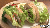 「よろずカフェらくら」では、その金目鯛のスモークボーンや、金目鯛の加工品を用いて作ったオリジナルのサンドイッチ「らくらサンド」を提供しています。「らくらサンド」は3種類の味が楽しめます。1つはスモークボーンを一度あぶってから身をほぐし、味を調えてからサンドに挟んだもの。もう1つは「金目スモーク」という生ハム仕立ての金目鯛を挟んだもの。さらにもう1つは、金目鯛の水煮缶をほぐしてマヨネーズで仕立てて挟んだもの。1度で3つの味を楽しめると人気になっています!