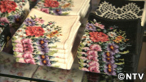 また、こちらのファクトリーショップでは、ショーウィンドウ越しに「シェニール織り」の製造工程を見ることができます。「シェニール織り」とは18世紀にヨーロッパで生まれた技術。非常に手間ひまの掛かる工程で製作され、使われている織り機は30年ほど前に店をたたんだドイツの工房から譲り受けた貴重なものだとか。世界中でも数少ない手織りで今も作られていて、熟練の職人でも1日に3.5メートルほどしか織ることができないそうです。