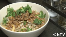 「から~ぷ麺」は、タイ料理を愛する店主のオリジナル!タイ北部の伝統料理、豚肉をハーブなどで炒めた「ラープ」を、米粉で打った麺の上に乗せた旨辛麺です!