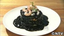 おかず系のパンケーキに力を入れているブリーズカフェ。真夜中のパンケーキのソースは玉ねぎとトマト、にんにくのソースにイカスミを加えています。