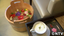 お湯を入れた木桶に季節の花を浮かべ、足をつけるとリフレッシュ!