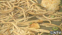オリーブオイルが味の決め手!4種類のお肉を堪能したあとは、その旨みが残る鍋で、日本蕎麦を炒めていただきます。