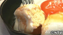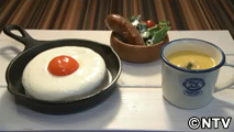 静岡産のブランド卵専門店、「TAMAGOYA」。レストランで味わえる「メダマヤーキ」とは、パティシエたちが完成させた新メニュー。朝採れの卵を贅沢に使ったパンケーキを、白身に見立てた、「ミルクソース」で覆い、特別な方法で黄身を閉じ込めた「卵黄ソース」を乗せた、目玉焼きそっくりのスイーツです。