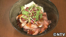 ポーク、ビーフ、チキン、三種のロースト肉がご飯の上に乗った丼。ビーフにはポン酢ジュレ、チキンには燻製マヨネーズ、ポークには生姜ダレと、それぞれに相性のいい三種類の味付けにもこだわっています。